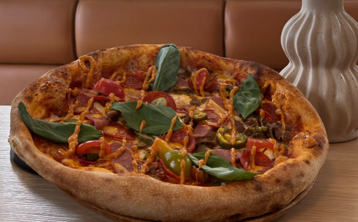 Tomatsós, rivin Mozzarella, shawarma, pepperoni, skinka, jalapeno, heimagjørd chili dressing, cheddar sós & rukola