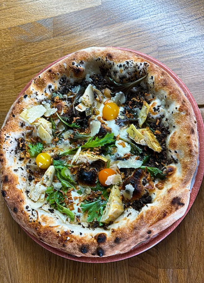 Ostasós, Rivin ostur, Truffle, Champignon, Parmigiano, Salat Mix, Artichoke